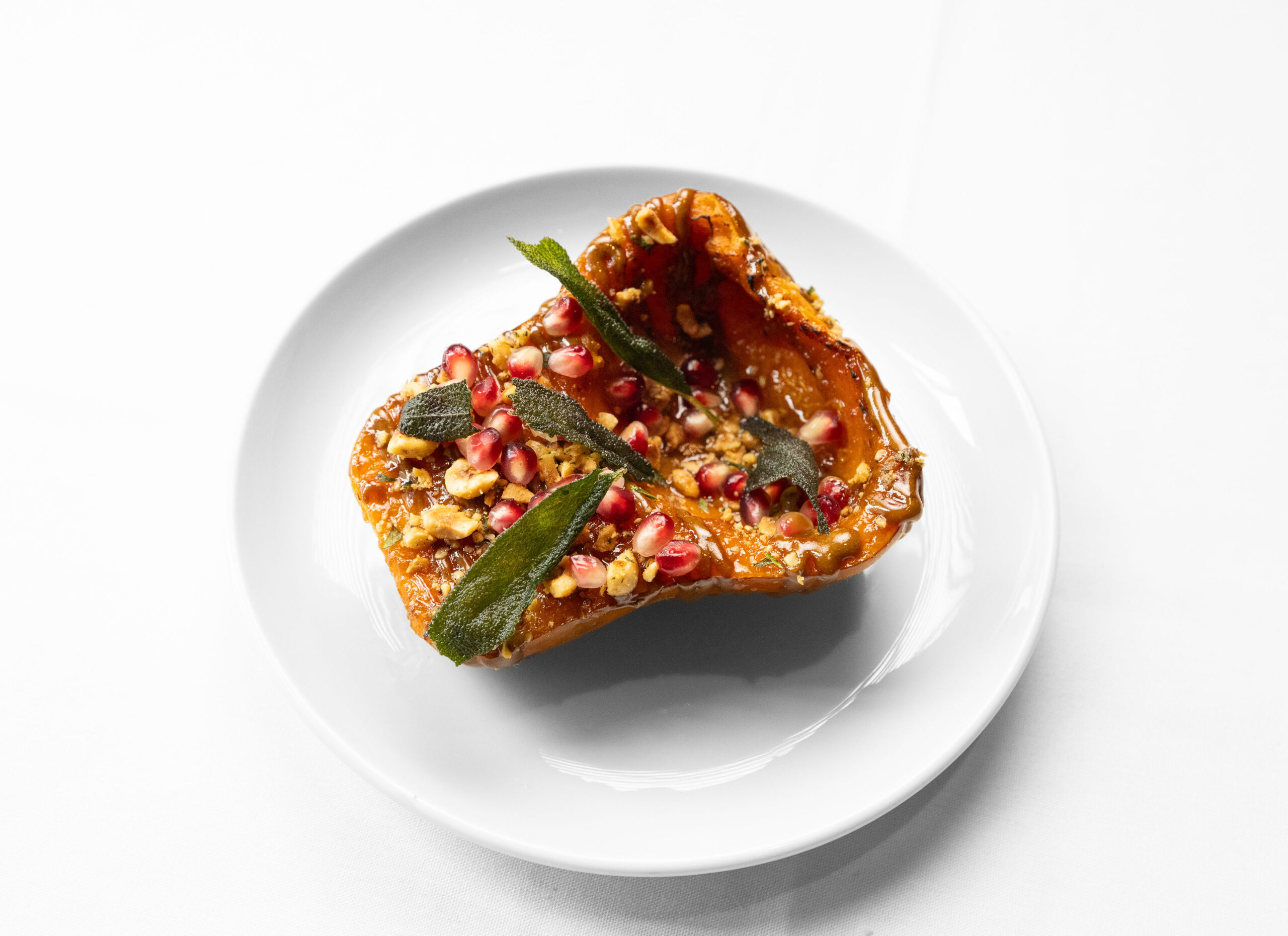 River dog farms honeynut squash, miso-apple butter glaze, black garlic aioli, pomegranate seeds, hazelnut crumble, crispy sage
