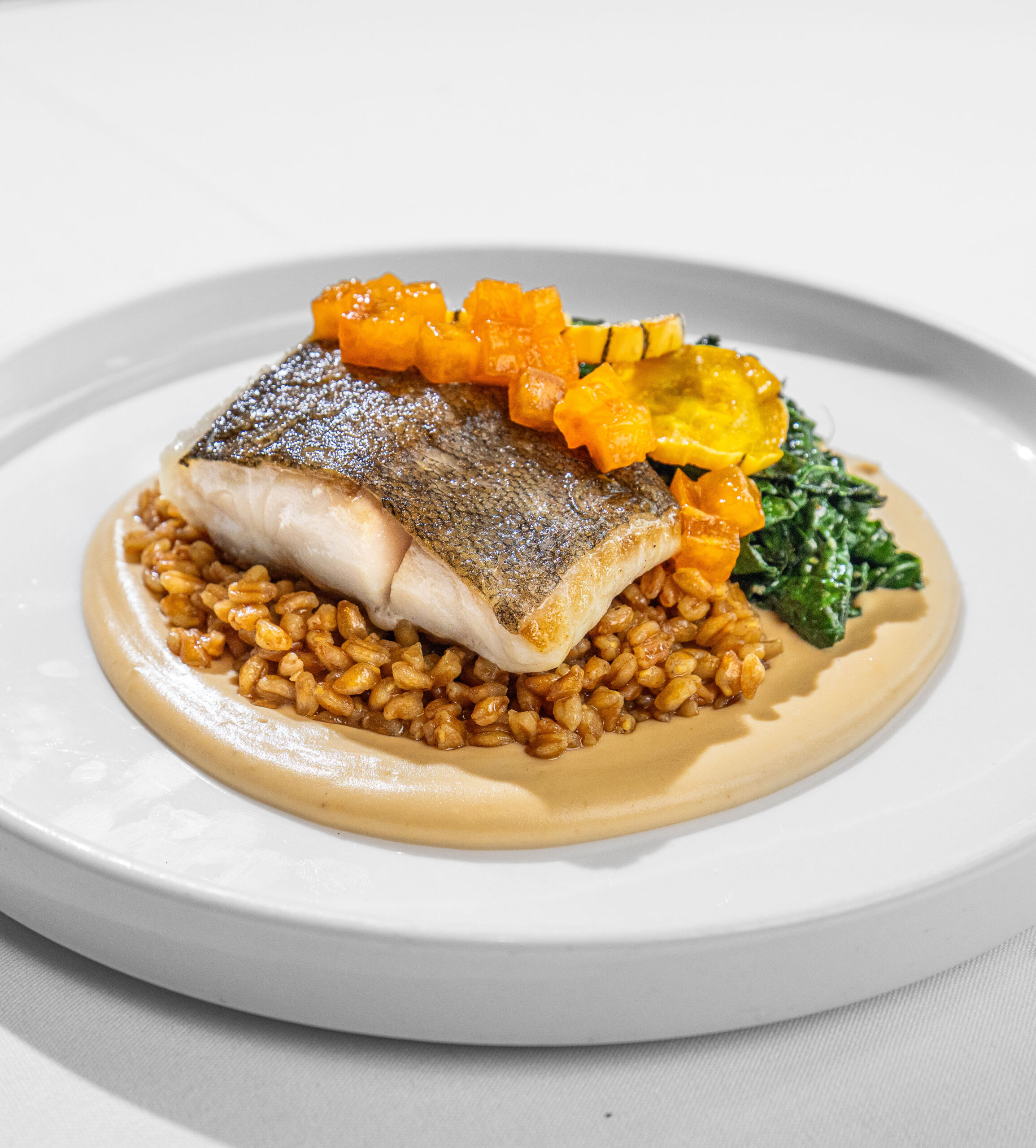 Caramelized celery root puree, brown butter farro, compressed twin peaks persimmons, kale, ray yeung farms delicata squash